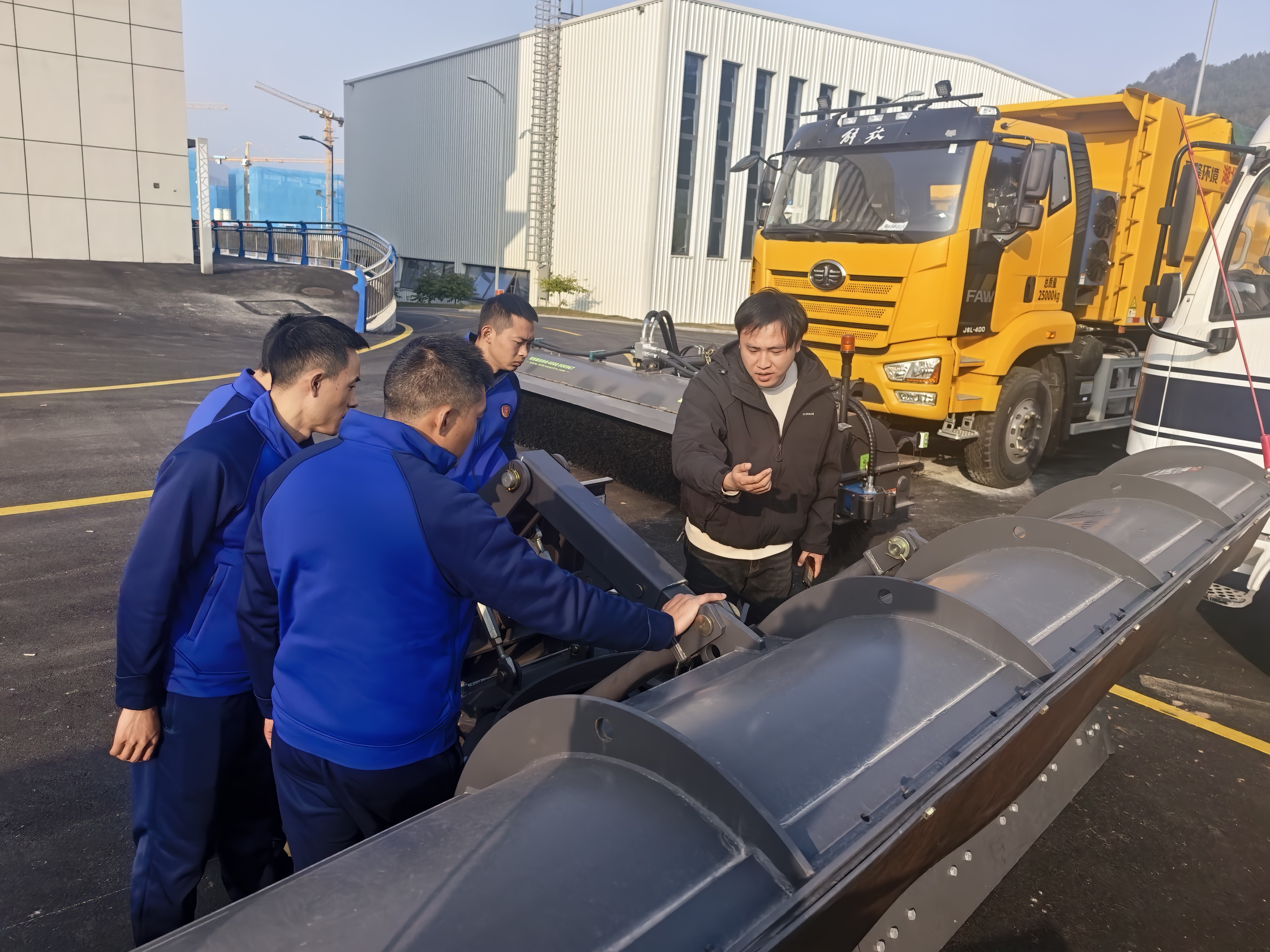 此次培训特邀设备厂家技术人员现场授课,打破“重理论、轻实操”传统模式,采用“手把手教学+沉浸式演练”相结合的方式。技术人员先围绕除雪车工作原理、安全操作准则等核心知识开展理论讲解,随后带领队员进入实操环节——从除雪铲的精准组装、除雪滚刷的快速更换,到道路破冰滚的高效作业、融雪剂布撒装置的规范操作,每一个步骤都拆解演示、逐一指导,确保队员们熟练掌握设备操作要点,能在应对突发雪灾天气时“拉得出、用得上、打得赢”。